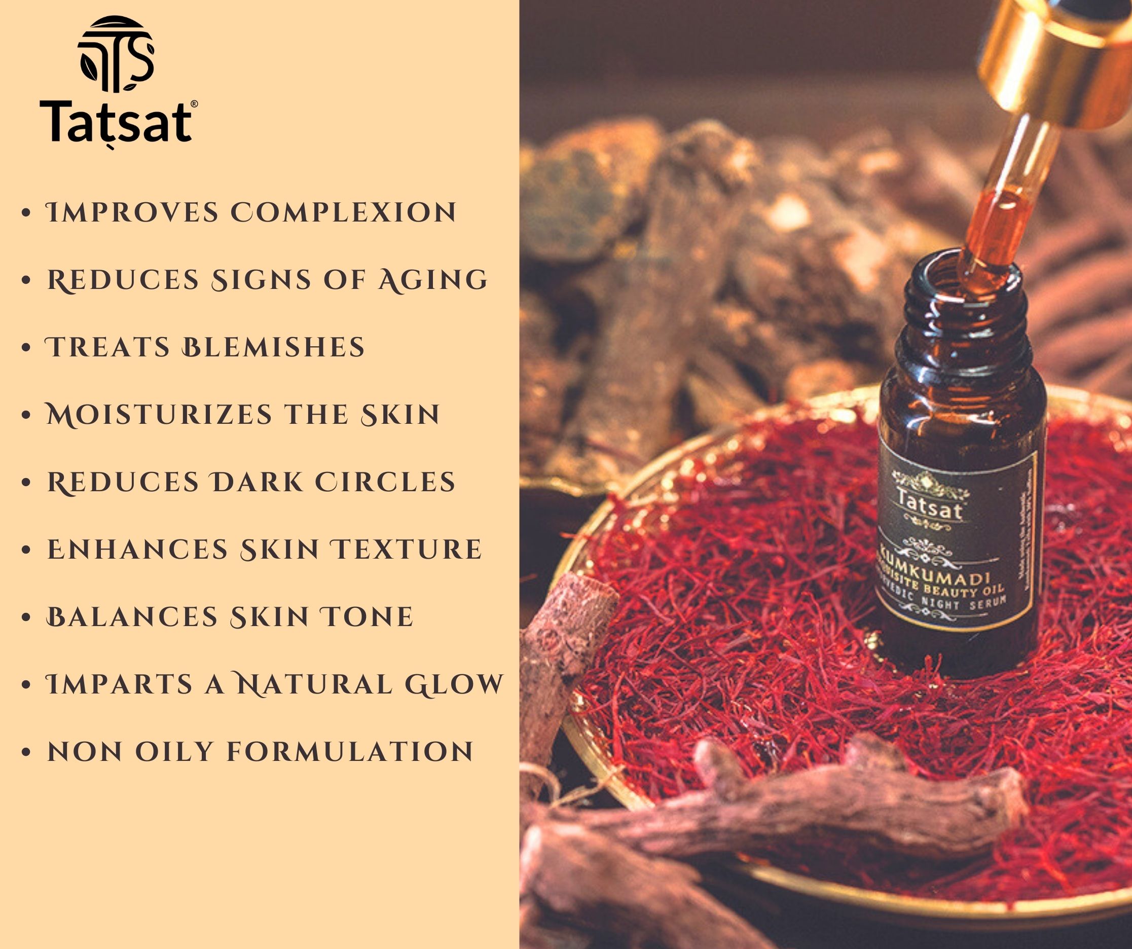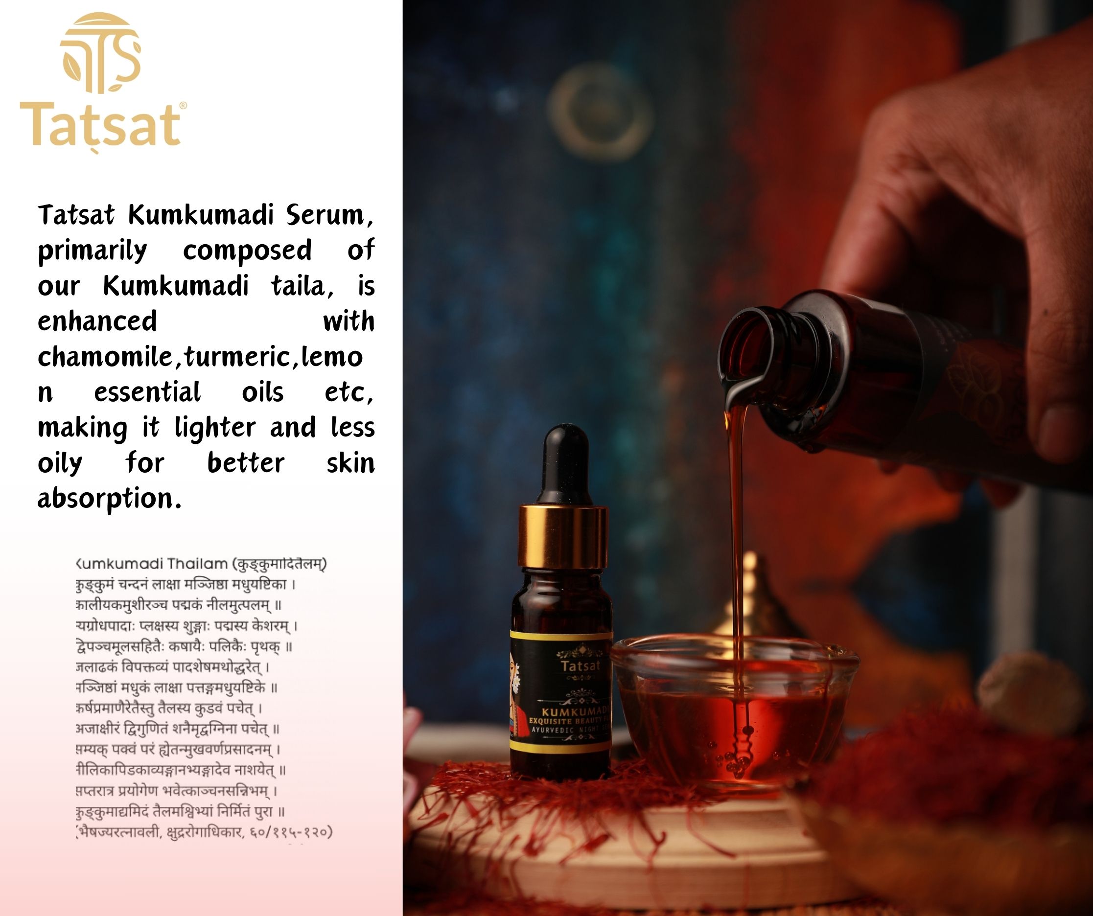 TATSAT Certified Ayurvedic Kumkumadi Exquisite Face Serum with Authentic kumkumadi oil with 30% Saffron & 23 VARNYAKARA herbs for spotless, wrinkle free glowing skin-10ml